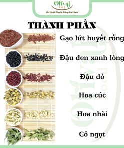 – Thành phần: Gạo lứt huyết rồng, đậu đỏ, đậu đen xanh lòng, hoa cúc, hoa nhài, cỏ ngọt.